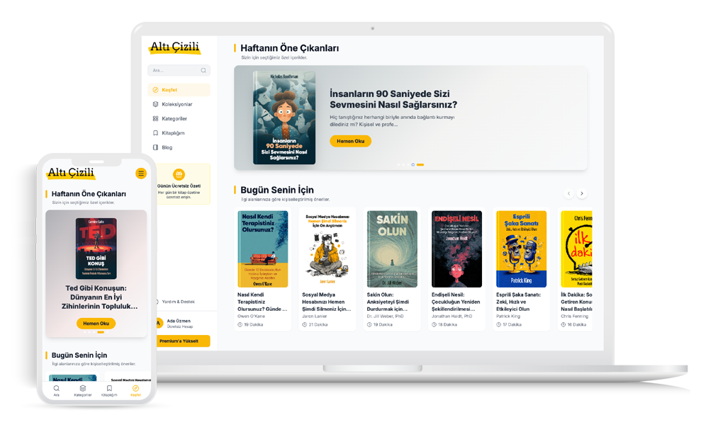 İster sabah kahveni içerken telefondan, ister iş aralarında bilgisayardan, ister akşam koltuğunda tabletinden… Altı Çizili seninle her yerde. Sadece bir cihaz değil, bir an yeterli.